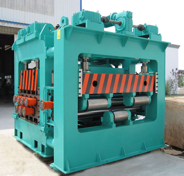 (2)機構構造:由兩支夾送輥、十一支校平輥、上下各兩排支撐輥、驅動裝置及本體承架等構成。所有機架均為鋼板焊接結構件,剛性好,強度高。校平機為四重式結構,工作輥兩層,支撐輥兩層,上下校平輥均由支撐輥支撐,以增加校平輥的抵抗變形的能力。上校平輥及支撐輥固定在一剛性滑塊上, 滑塊可分別由電機經蝸桿絲杠副帶動其升降或傾斜,以改變其校平間隙及校平傾角,保證校平精度,同時方便在加工不同厚度板材,操作工人能快速的進行調整,縮短輔助時間,提高工作效率。間隙調整值由刻度表顯示。主動力為直流電機驅動,經制動器、減速機、齒輪分配箱、萬向聯軸節,使各輥均有動力,通過直流調速器運行無級調速。各輥支撐全部采用滾動軸承,油脂潤滑。